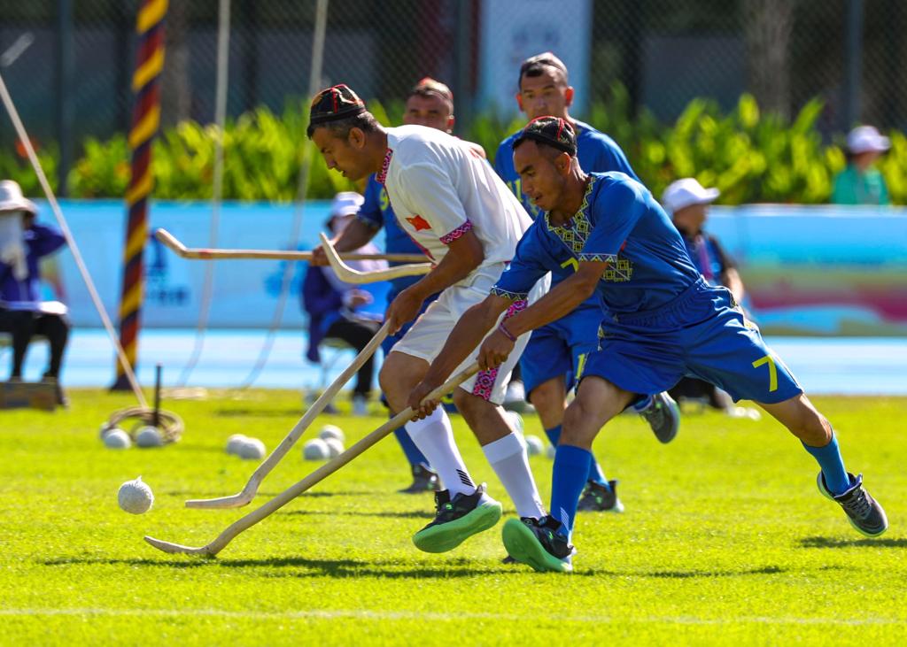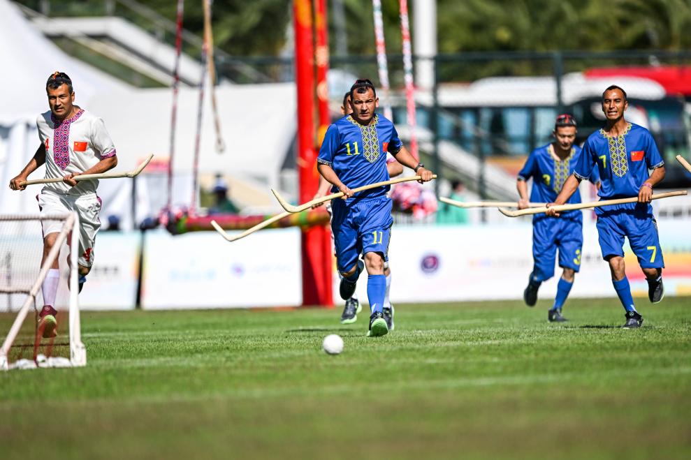 新华社三亚11月25日电(记者孙哲)头戴维吾尔族花帽的运动员们灵活穿梭,用手中的木制球杆将棉线缠绕而成的球挥出一道弧线……