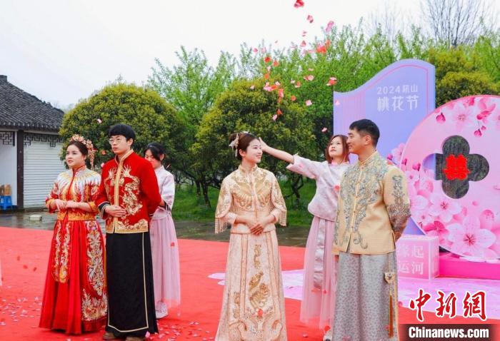 近日,多对新人在桃花林里举行中式婚礼。越城区委宣传部 供图