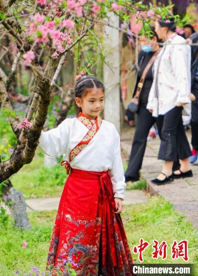 近日,一名身穿马面裙的女孩在桃树下留影。越城区委宣传部 供图