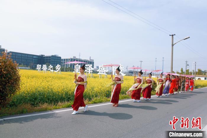 走进绍兴市柯桥区安昌街道盛陵村,油菜花在微风吹拂下“金浪起伏”。油菜花田一侧,来自当地乡村舞蹈队的十多名女子身穿艳丽的中式服饰,撑着油纸伞,缓慢走来。远远望去,红色与黄色形成鲜明对比,构成一幅生动的画卷。