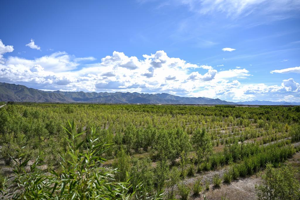 2024年9月1日,在雅江北岸南木林生态示范区,郁郁葱葱的林木和湛蓝的天空相映成景。新华社记者孙瑞博 摄
