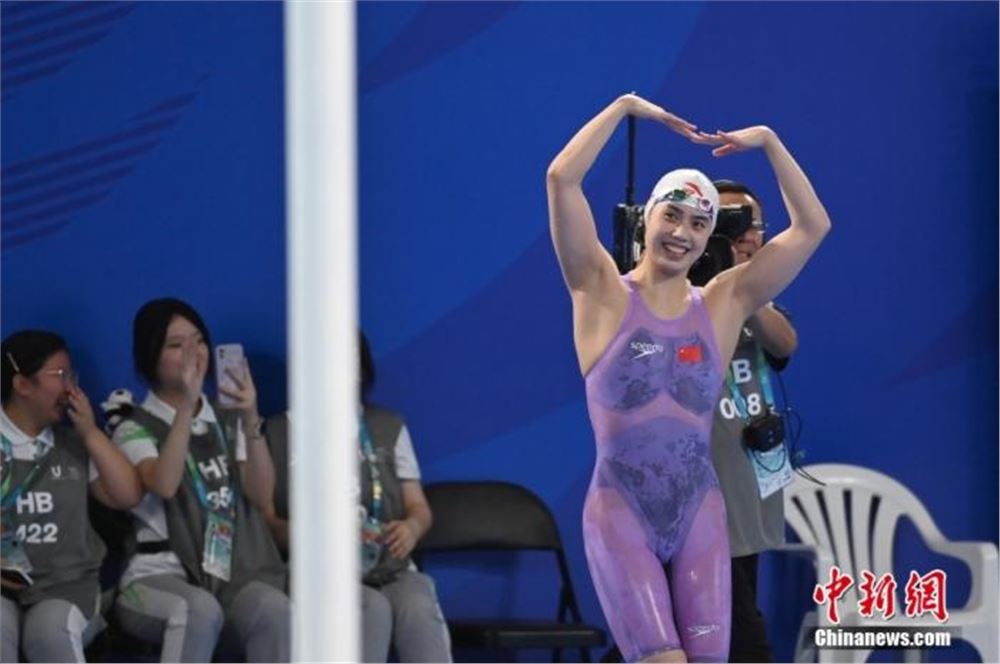 资料图:成都大运会,张雨霏向观众“比心”。中新社记者 安源 摄