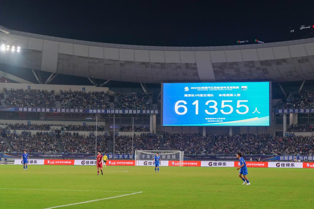 10月4日,在江苏南京举行的2025江苏省城市足球联赛(“苏超”)四分之一决赛中,南京队主场与连云港队在常规时间1比1战平,通过点球大战,南京队以5比3的总比分战胜连云港队,晋级半决赛。大屏幕显示本场比赛共有61355名球迷到场观赛。新华社记者 李博 摄