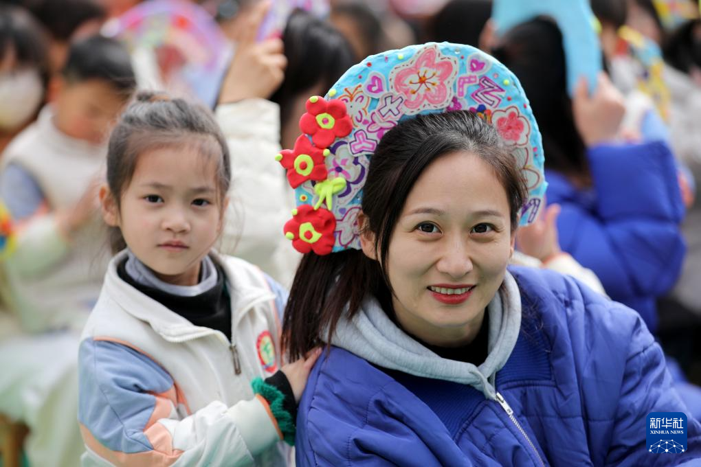 3月6日,在安徽省黄山市示范幼儿园开展的“巧手学簪花 快乐迎‘三八’”主题活动中,妈妈和孩子一起体验手工簪花制作。