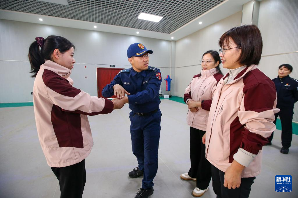 3月6日,在山东省济南市公安局人民警察训练基地,北康社区妇女在民警的指导下学习女子防身术。新华社发(郝鑫城 摄)