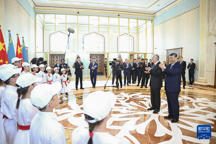 习近平在托卡耶夫陪同下检阅仪仗队。十余名哈萨克斯坦少年儿童用中文演唱《歌唱祖国》。