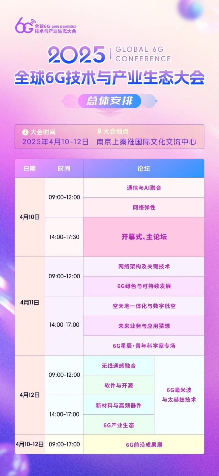 4月10日至12日,由未来移动通信论坛、紫金山实验室主办的2025全球6G技术与产业生态大会(原全球6G技术大会)将在南京上秦淮国际文化交流中心召开。本次大会以“共筑创新 同享未来”为主题,来自全球的6G领域的思想领袖、技术先锋和产业领军人物将再次齐聚金陵,共同探讨6G技术创新与未来产业生态的发展蓝图。