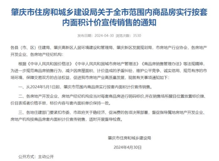 中新网5月7日电 近日,广东肇庆市住房和城乡建设局发布的通知显示,从2024年5月1日起,肇庆市范围内商品房实行按套内面积计价宣传销售。同时公布的《肇庆市促进房地产业高质量发展若干措施》明确,优化房地产开发项目计容要求。