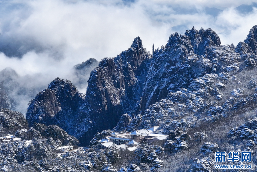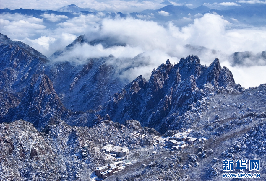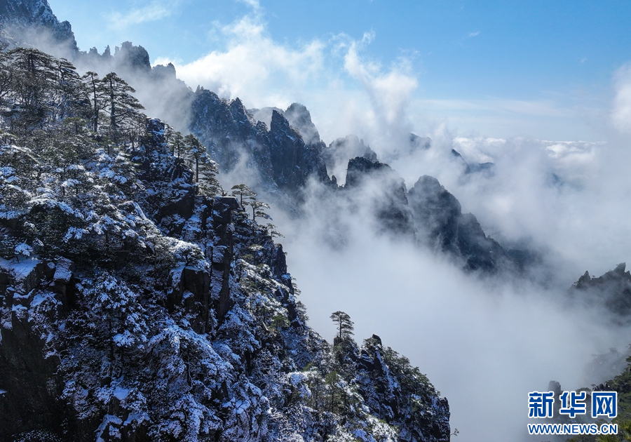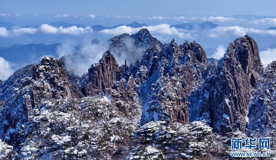 2月18日,在安徽省黄山风景区拍摄的初春雪后美景(无人机照片)。新华网发(施亚磊 摄)