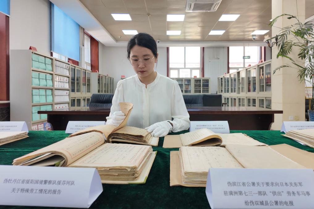 黑龙江省档案馆工作人员展示此次展出的档案。新华社记者何山 摄