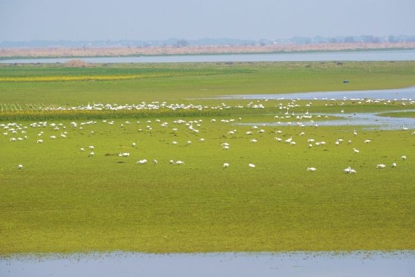 环行安乡珊珀湖,湖面水鸟云集,湖畔水草丰美。