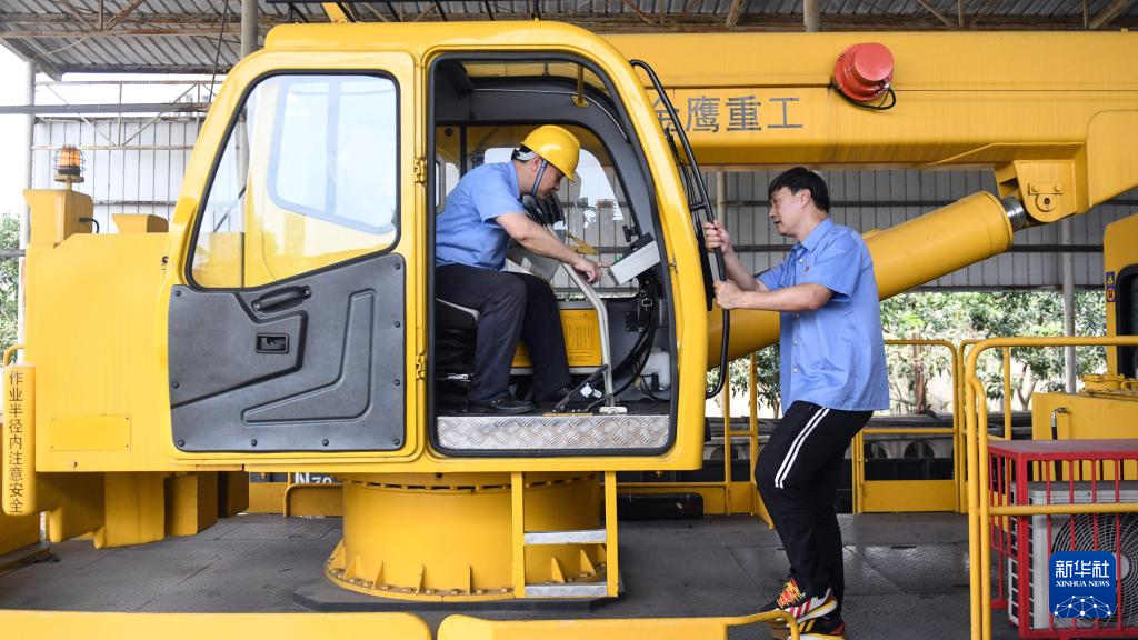 彭春林(左)在柳州动力设备车间检查接触网作业车防倾覆装置使用情况(4月25日摄)。新华社记者 张爱林 摄