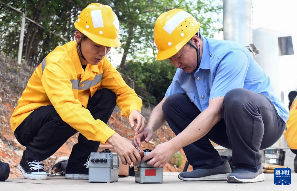 彭春林(右)在国铁南宁局职工培训基地指导青年职工使用电极型接地仪测试卡(4月25日摄)。新华社记者 张爱林 摄