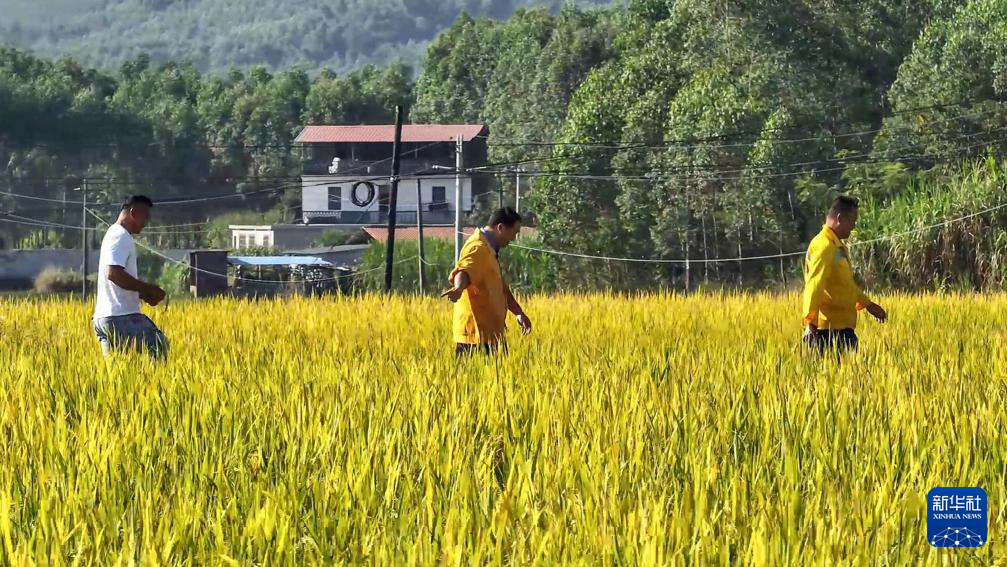 在广西柳城县,彭春林(中)和工友帮助推进“旱改水”项目建设(2024年8月27日摄)。新华社记者 张爱林 摄