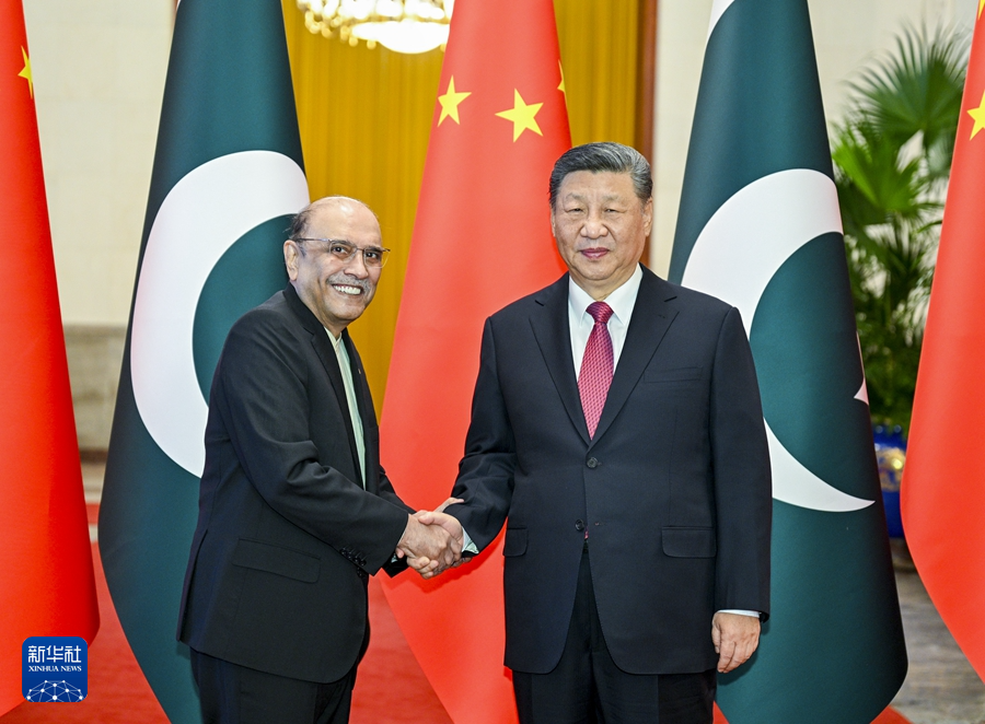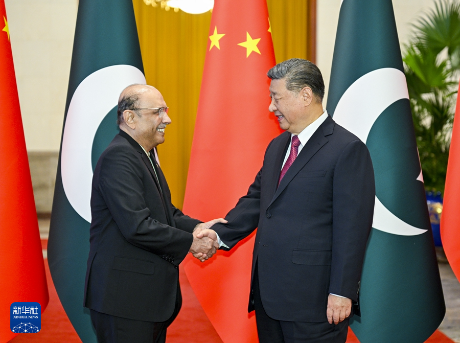 2月5日下午,国家主席习近平在北京人民大会堂同来华进行国事访问的巴基斯坦总统扎尔达里举行会谈。这是习近平同扎尔达里握手。