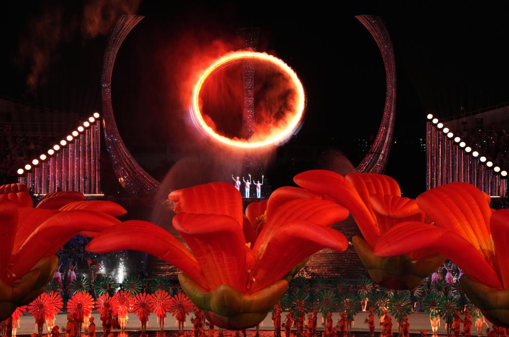新华社广州11月10日电(记者王浩明、赵紫羽、田宇)9日晚,广东奥林匹克体育中心,十五运会的开幕式在这里举行,当十五运会主火炬塔“天海之冠”被三地健儿共同点亮那一刹,灯火辉煌,掌声雷动。