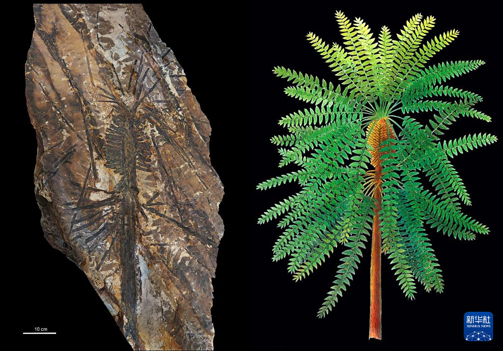 这是在内蒙古自治区乌达二叠纪植被化石产地发现的植物化石及植物复原图(资料图片)。 新华社发