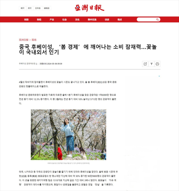 湖北春季赏花游与“五一”假期游市场成绩亮眼。近日,韩国《亚洲日报》、泰国媒体Khaosod Online发表文章,高度评价湖北在推动旅游市场繁荣、丰富旅游业态、促进消费升级等方面的举措,称赏花关注热度已转化为经济能量,成为中国文旅的“顶流”,撬动了“春日经济”。