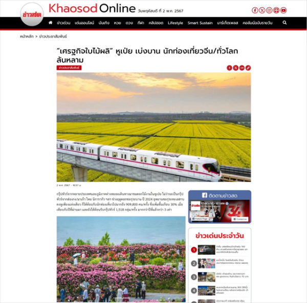 泰国媒体Khaosod Online发文介绍,春赏樱花已成为湖北的名片。为顺应春季旅游市场特点和不同群体的消费需求,湖北推出“跟着花期去旅游”“跟着演唱会去旅游”等主题产品,举办“相约春天赏樱花”暨湖北最美赏花季活动,发布2024赏花地图和200多个赏花打卡点,掀起全省赏花热潮,武汉市入选中国十大热门赏花游目的地。