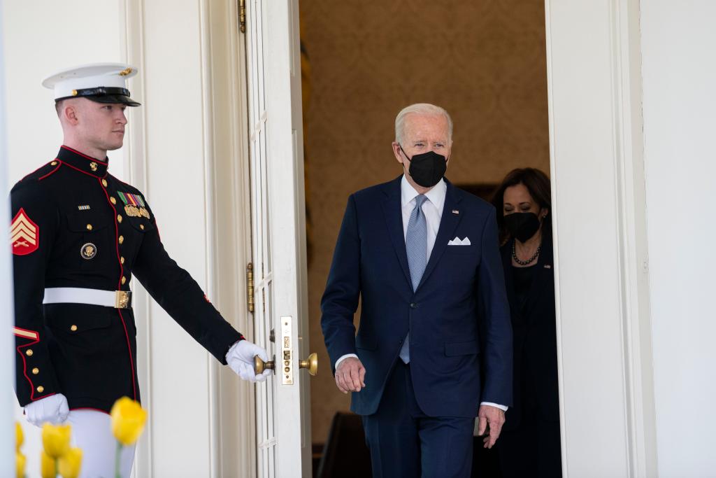 2022年4月11日,时任美国总统拜登(左二)准备在华盛顿白宫发表讲话。(新华社记者刘杰摄)