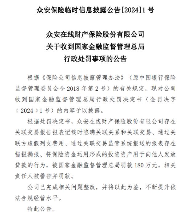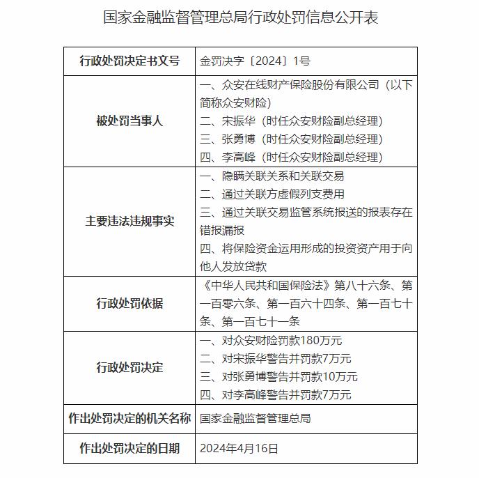 根据国家金融监督管理总局行政处罚信息公开表(金罚决字〔2024〕1号),众安在线财产保险股份有限公司(简称“众安财险”)被罚款180万元。三名时任副总经理均被给予警告并罚款。