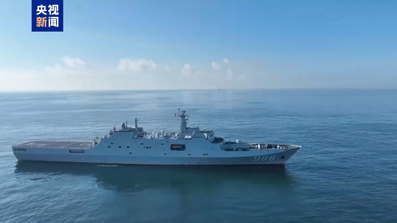 海军沂蒙山舰(舷号988)于2016年2月入列服役,属071型船坞登陆舰,总长210米,宽28米,正常排水量19000余吨,具有吨位大、装载能力强、续航里程远等突出特点。可执行快速、立体、机动登陆作战,输送救灾物资,提供医疗救援等使命任务。(总台记者 马媛)