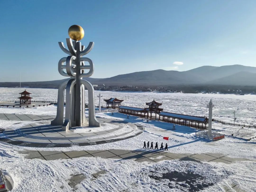黑龙江佳木斯黑瞎子岛边境管理大队移民管理警察踏上冰封的江面开展步巡踏查。(邱治博摄)