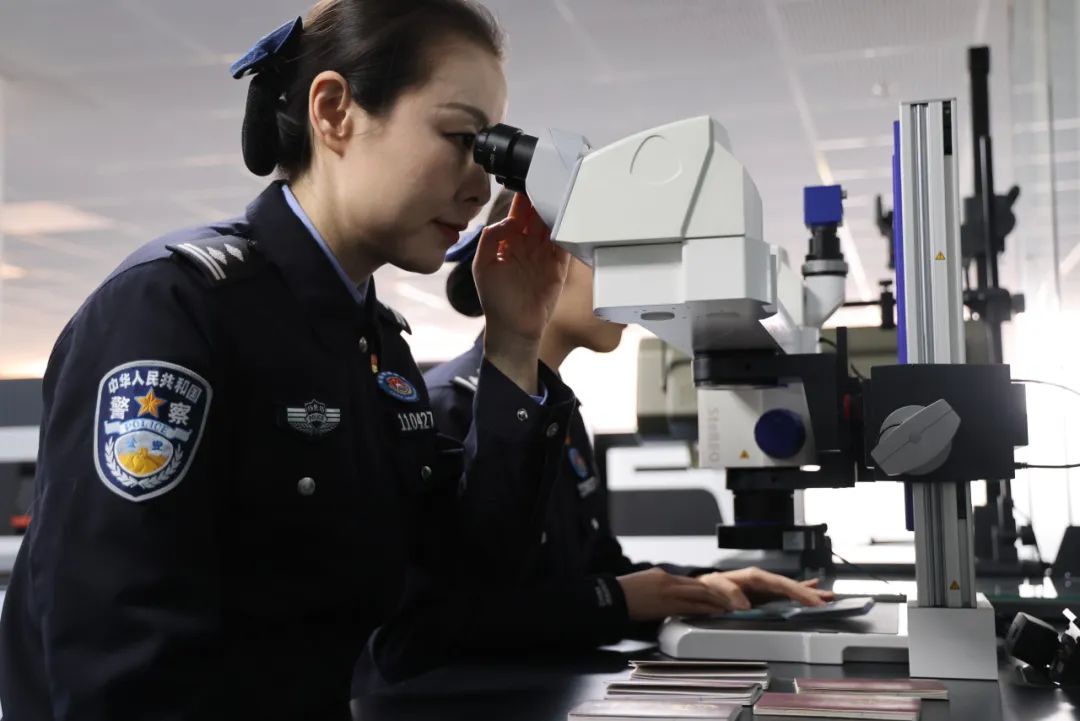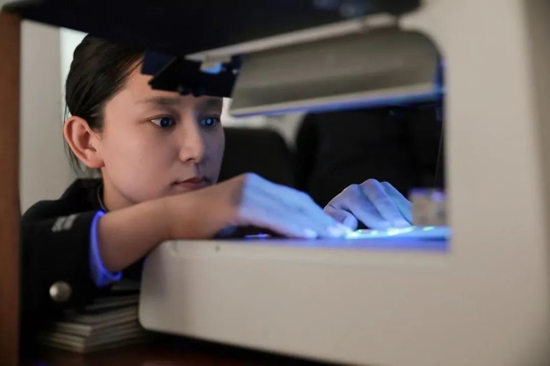 北京边检总站证研室移民管理警察使用仪器辨别出入境证件真伪。(张建鑫摄)