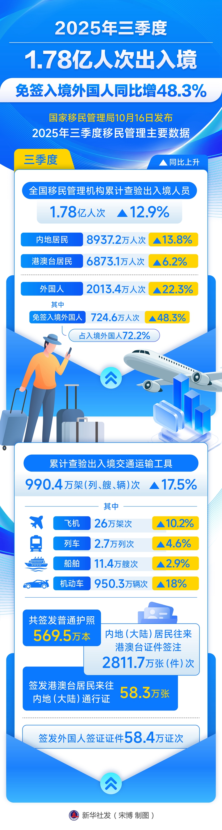 新华社北京10月16日电(记者 任沁沁)国家移民管理局16日发布2025年三季度移民管理主要数据。三季度,全国移民管理机构累计查验出入境人员1.78亿人次,同比上升12.9%。内地居民8937.2万人次、港澳台居民6873.1万人次,同比分别上升13.8%、6.2%;外国人2013.4万人次,同比上升22.3%。其中免签入境外国人724.6万人次、占入境外国人72.2%,同比上升48.3%。