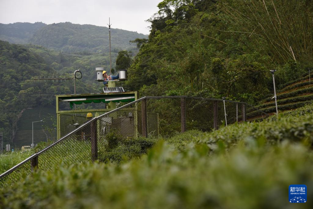 工作人员在新北市坪林区大林里的茶园中检修环境监测设备(4月7日摄)。新华社记者 刘斐 摄