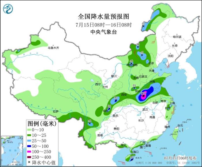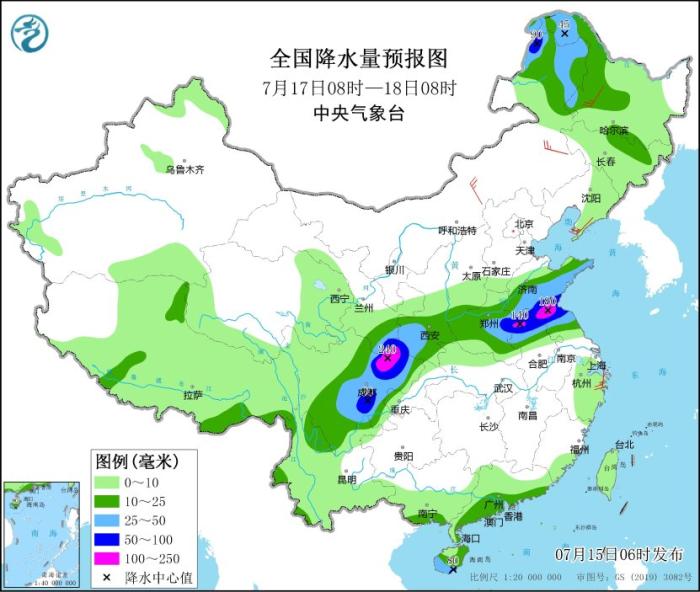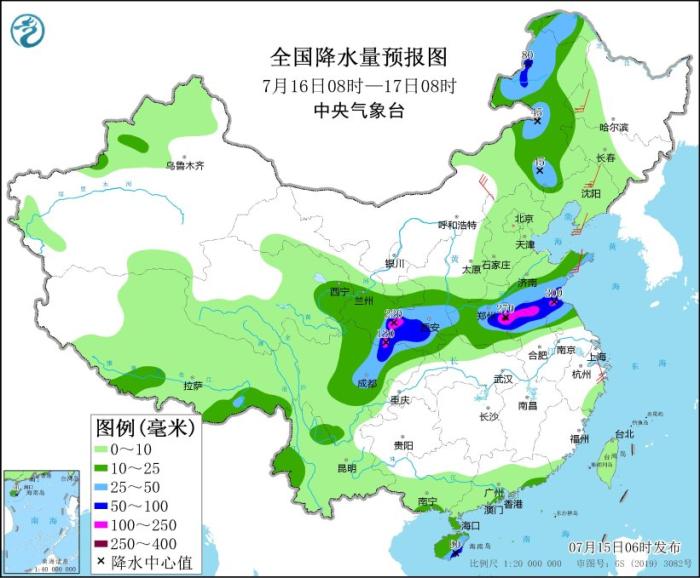 预计,7月15日08时至16日08时,陕西西南部、四川盆地西部和北部、河南中东部、湖北北部、安徽北部、江苏北部、山东南部及内蒙古中部、河北北部、海南岛东南部等地部分地区有大到暴雨,其中,河南东部等地部分地区有大暴雨,局地特大暴雨(250~270毫米)。上述部分地区伴有短时强降水(最大小时降雨量30~50毫米,局地可超过80毫米),局地有雷暴大风等强对流天气(见图1)。中央气象台7月15日06时继续发布暴雨黄色预警。