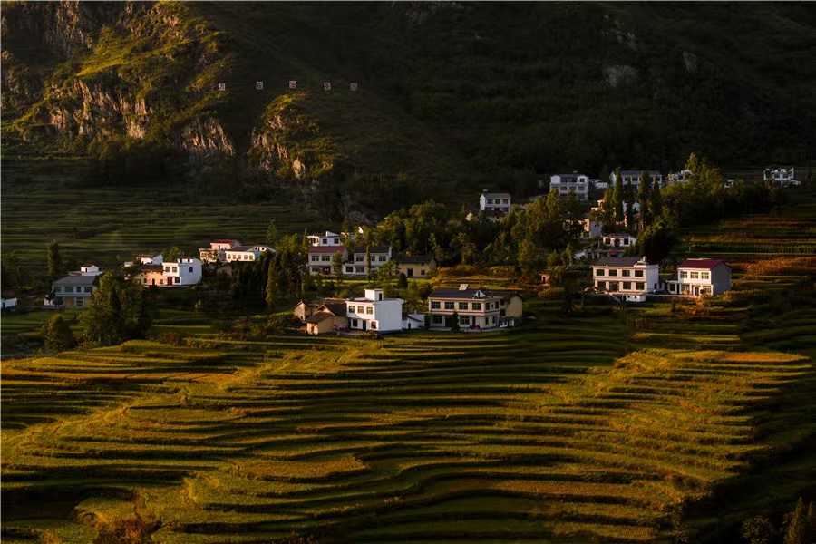 图为位于陕西省汉阴县漩涡镇的梯田与民居。(姜泽宇 摄)