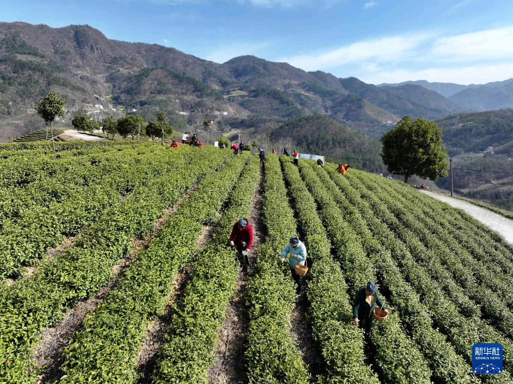 3月18日,湖北省宜昌市秭归县茅坪镇松树坳村村民在茶园采摘新茶(无人机照片)。新华社发(郑家裕 摄)