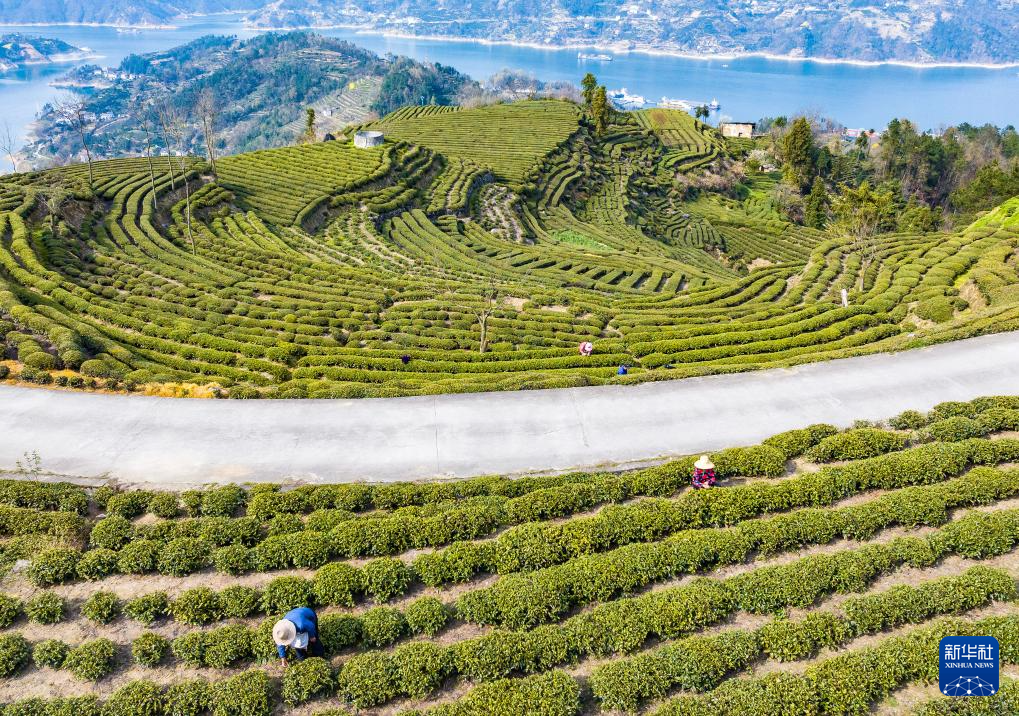 3月18日,湖北省宜昌市秭归县茅坪镇陈家坝村村民在茶园采摘新茶(无人机照片)。新华社发(郑家裕 摄)