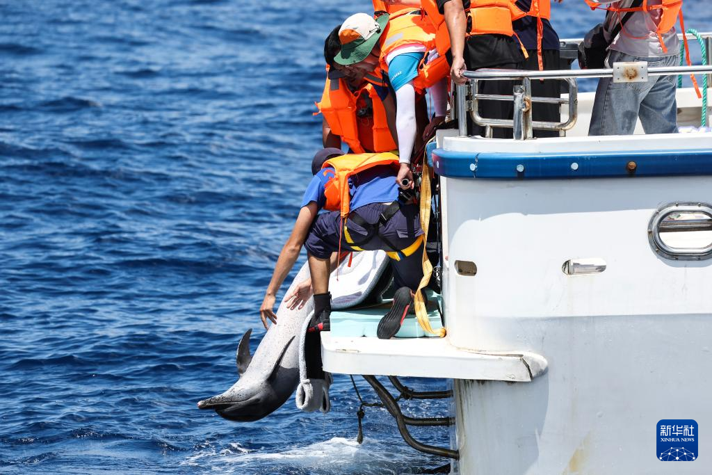 9月14日,在海南万宁一处海域,救助人员将海豚“万万”放归大海。新华社记者 张丽芸 摄