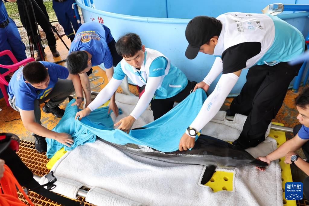 9月14日,在位于海南陵水的救助中心,救助人员将湿毛巾盖在海豚“万万”身上保湿。新华社记者 张丽芸 摄