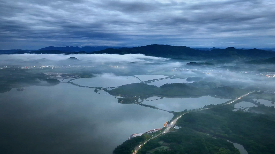 一场春雨过后,安徽省池州市云雾缭绕,城市、山峦和湖泊若隐若现,宛如一幅水墨丹青画卷。