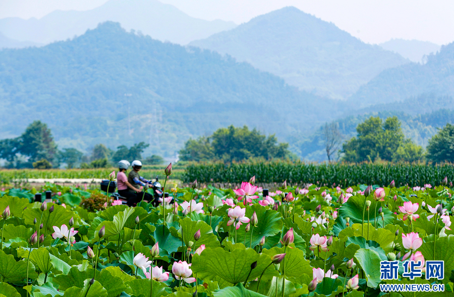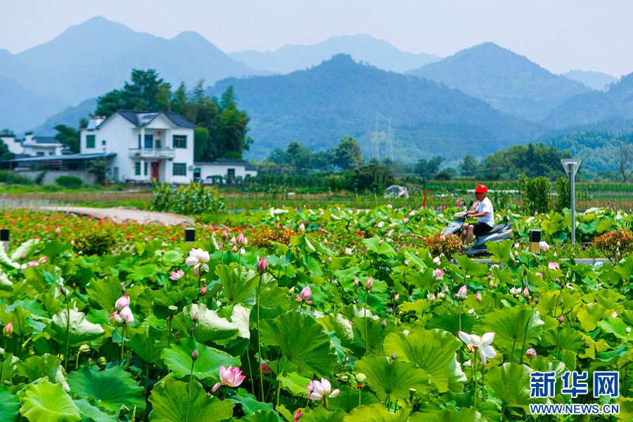 6月16日,安徽省黄山市休宁县盐铺村朵朵荷花渐次绽放。