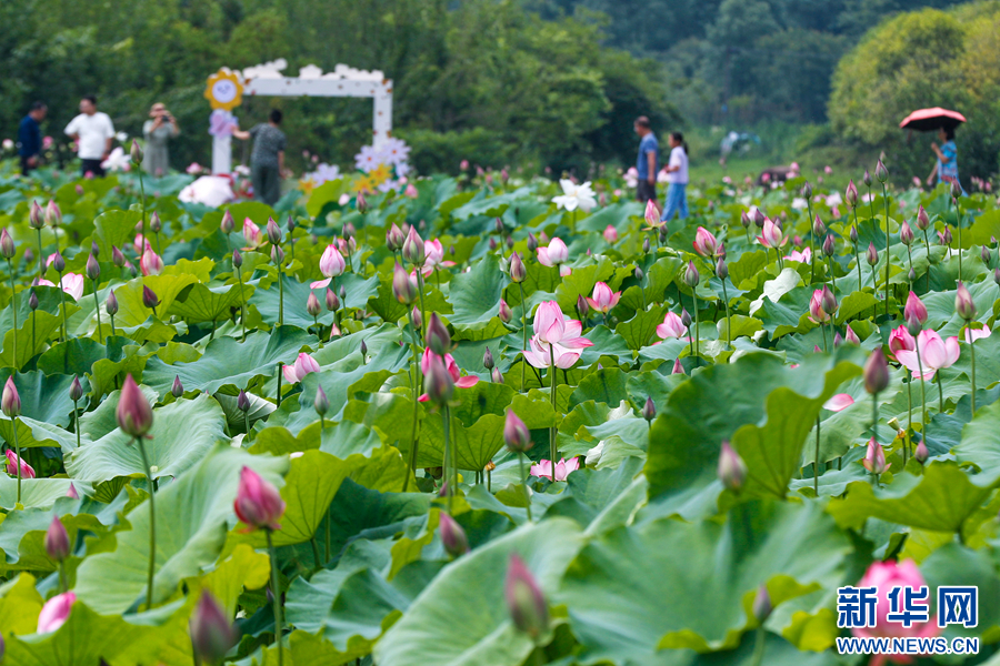 6月16日,游人在安徽省黄山市休宁县盐铺村观赏荷花。