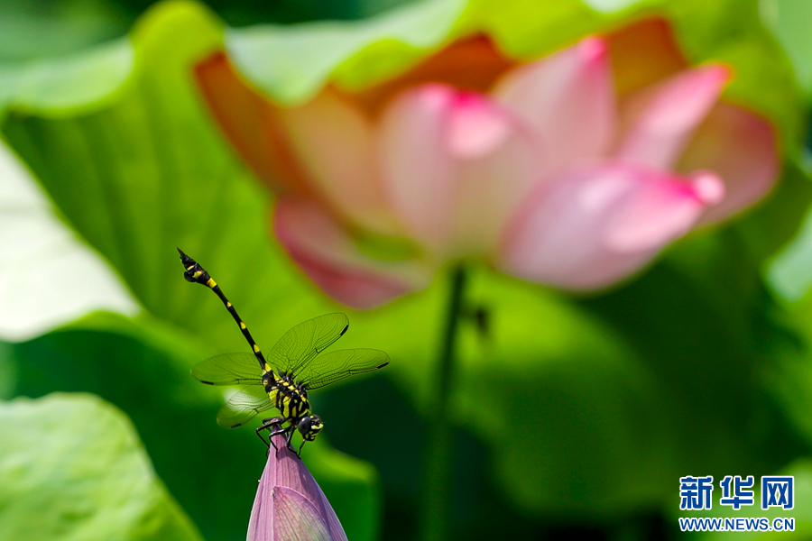 6月16日,在安徽省黄山市休宁县盐铺村,蜻蜓立在荷花上。