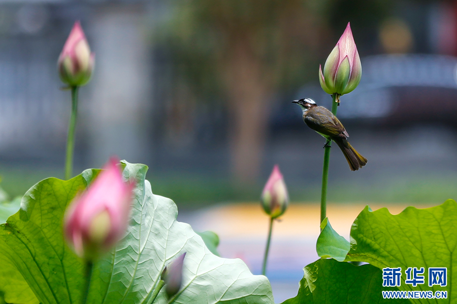 6月16日,在安徽省黄山市休宁县盐铺村,一只小鸟立在荷花上。
