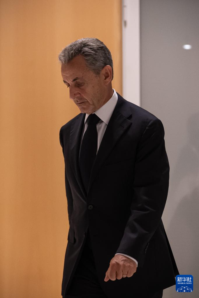 9月25日,在法国巴黎,法国前总统萨科齐在庭审后离开。新华社发(奥雷利安·莫里萨尔摄)