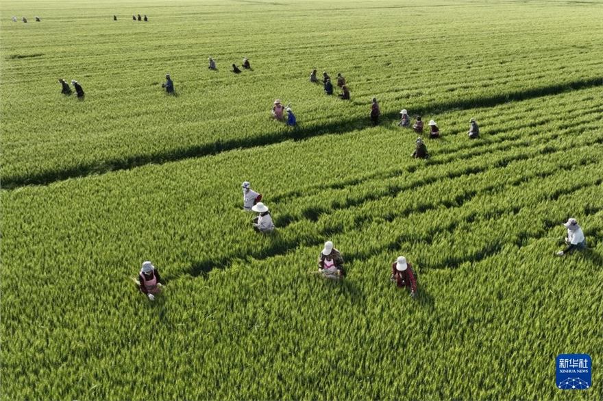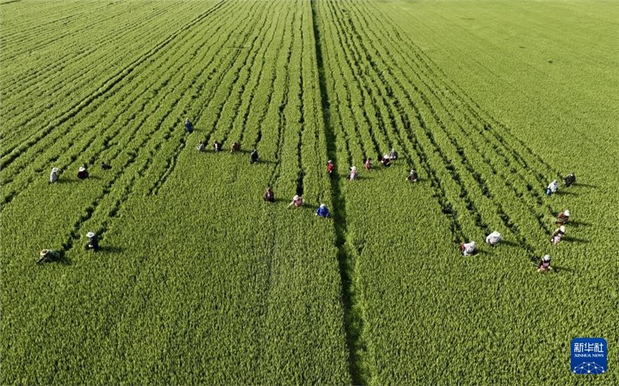 5月16日,河北省晋州市槐树镇北白水村的农民在麦种田内剔除杂穗(无人机照片)。