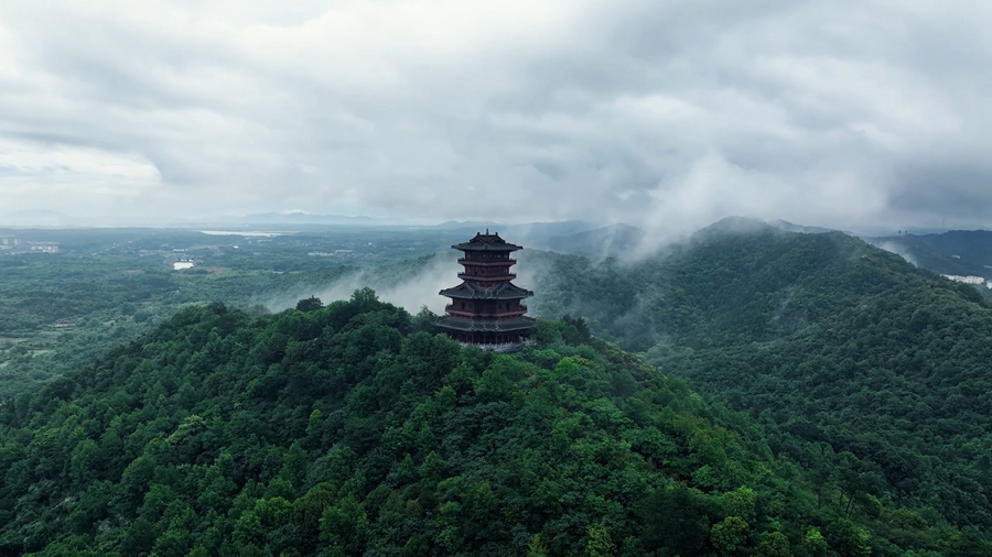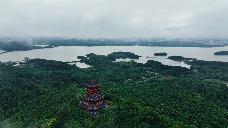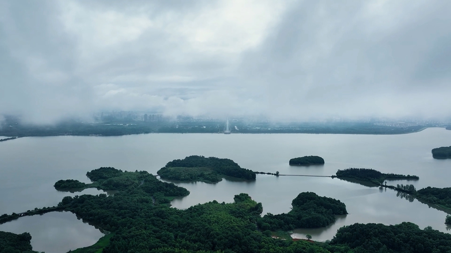 近日, 安徽省池州市平天湖,薄雾轻笼下,如梦似幻,与若隐若现的城市、山水,构成一幅流动的的丹青画卷。(陆军 王帆)