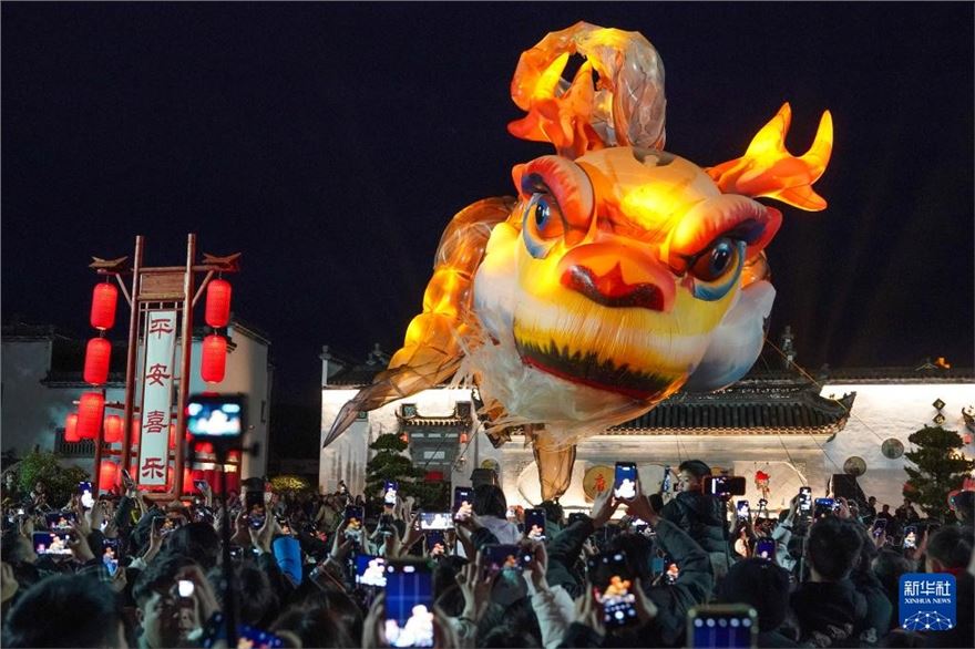 农历正月十一,在安徽省黄山市徽州区唐模古村,“徽州满池娇·独占鳌头”主题活动火热开展。巨大的鳌鱼灯在夜色中流光溢彩,伴随锣鼓队伍在古村上空飞旋,寓意“抬头见喜、独占鳌头”,吸引众多游客和市民驻足围观、拍照打卡,为即将到来的元宵佳节增添浓厚的节日氛围。