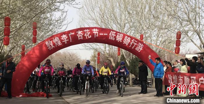 2018年4月1日,敦煌杏花节期间举办低碳骑行游。 艾庆龙 摄