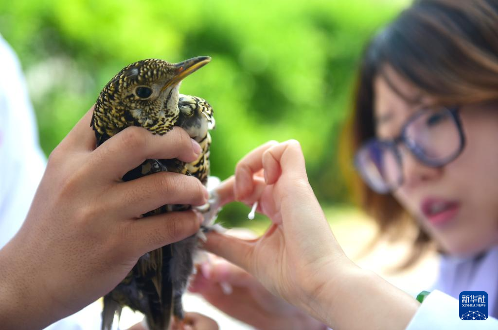 4月19日,沧州市野生动物救护中心工作人员为获救的国家二级保护动物虎斑地鸫进行体检。新华社发(傅新春摄)