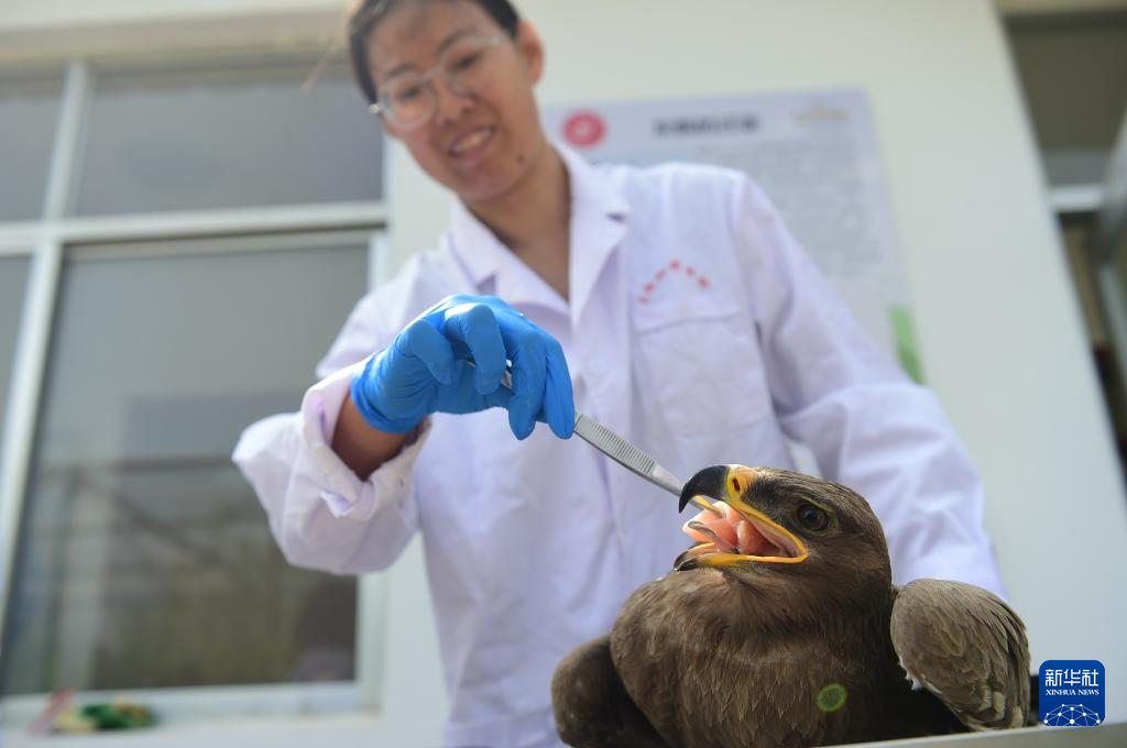4月19日,沧州市野生动物救护中心工作人员为获救的国家一级保护动物乌雕喂食。新华社发(傅新春摄)