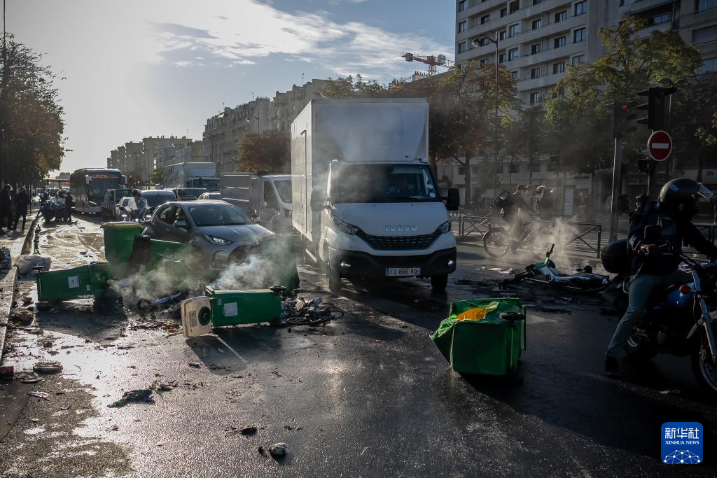 9月10日,在法国巴黎街头,示威者用垃圾桶封锁道路。新华社发(奥雷利安·莫里萨尔摄)