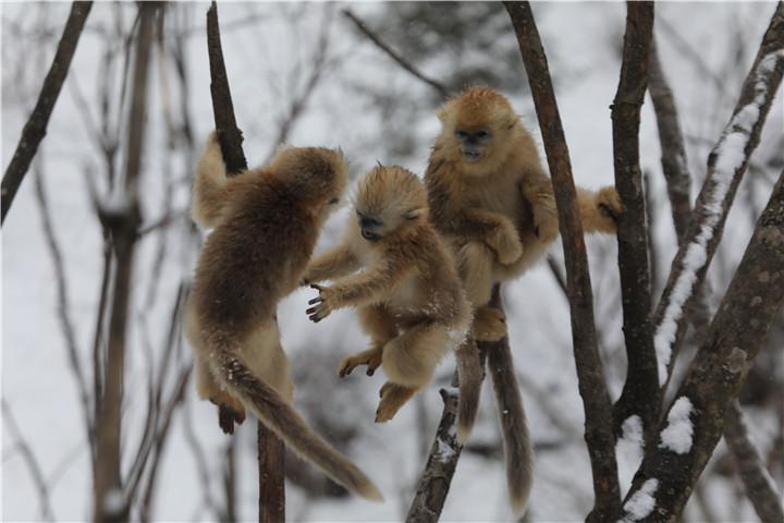 冬日在林间嬉戏的神农架金丝猴(神农架国家公园管理局供图)